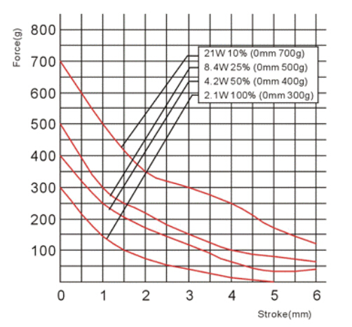 縱向:代表電磁鐵在對應行程時的力量 單位為克(g)