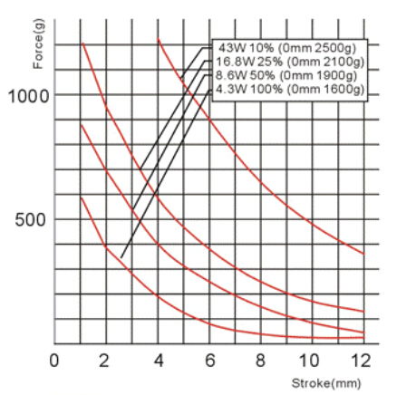 縱向:代表電磁鐵在對應行程時的力量 單位為克(g)
